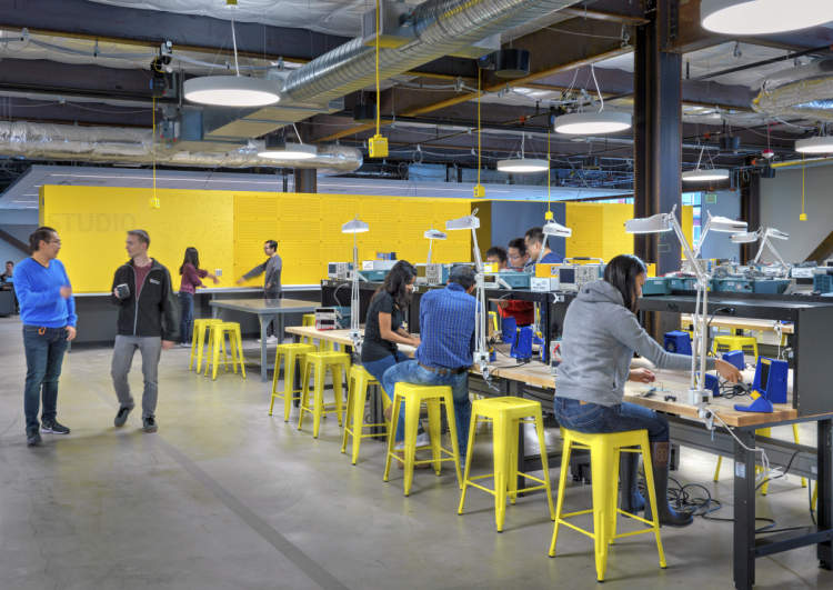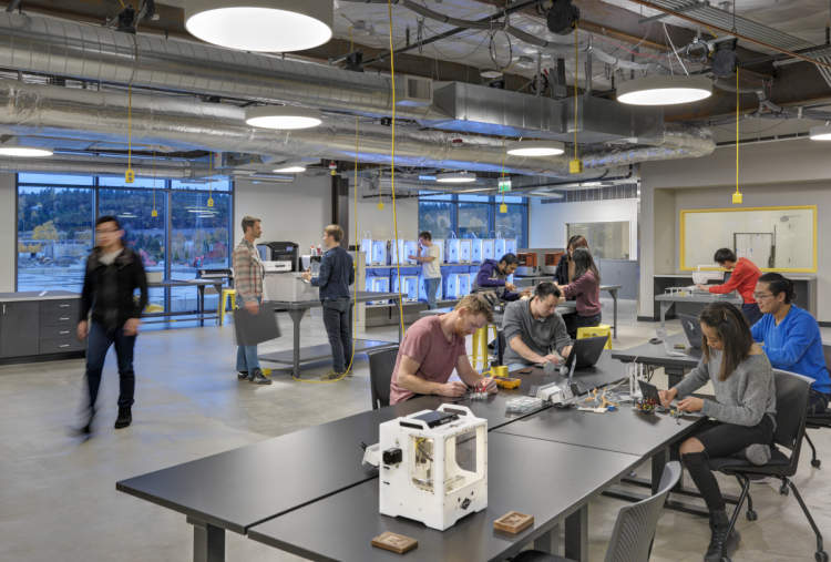 GIX大楼的整体设计理念为Creative Warehouse,一个孕育创新意识和创新技术的地方。学生们能够使用工业级的设备制造产品原型,从模拟工具、简易与先进的增材/减材制造,材料与电子器件的原型制作,到产品级的电子器件制造和物理加工。
