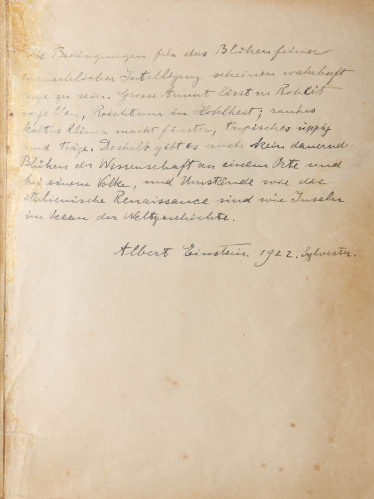 1922年除夕,爱因斯坦短暂登陆上海之际,曾在一对长期旅居上海的犹太人特里萨·伦纳(Theresa Renner ,1890-1987)夫妇家中小驻并留下前述文字。周到君今天在展览现场看到,这本首页就是爱因斯坦留言的珍贵留言册,共包含了79页的名人签名、题词、中国画、水彩画,甚至乐谱。