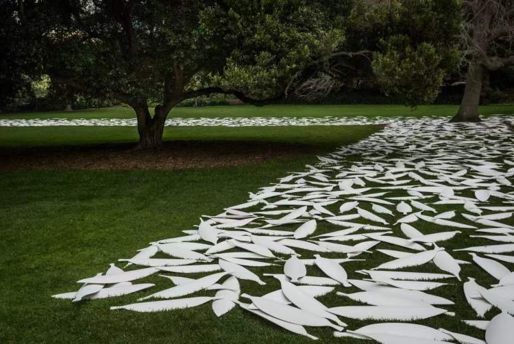 《皮肤与骨头》大型雕塑装置,位于澳大利亚悉尼市的皇家植物园,占地2万平方米,艺术家乔纳森·琼斯耗时17天重建了在1882年被烧毁前的19世纪花园宫殿建筑轮廓。这是艺术家为那曾被大火焚毁的、正从澳大利亚文化中渐渐消失的土著文化而创作的。艺术家的创作一方面表达对许多土著文化遗产不幸遗失的哀叹,另一方面也对这世界上最古老的充满活力的土著文化仍然存在表示欣慰和庆幸。作品包含三种元素:白色盾牌构成被毁建筑的轮廓、当地袋鼠草的草坪以及与当地社区居民共同制作的八处土著语的声音景观,它们分别表征着“损失”、“重生”和“开创”。