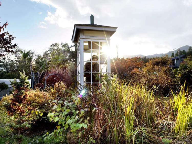 《风中的电话亭》位于2011年被海啸侵袭的大槌町一个露天山坡上,电话亭内设有一个可旋转拨号的电话和记事本,旁边有一把长椅,木质的标牌上写着“风中的电话亭”。这一场所是由大槌町居民佐佐木格于2010年在自己的花园中始建,最初是为了给自己一个私人空间,以抚慰他失去表兄的痛苦。2011年3月11日在海啸侵袭后很快完工,他决定把这一私密的电话亭空间向所有需要的人们开放。走进电话亭的人们,会习惯性地拿起听筒,有些人拨打号码,有些人则不会。因为电话未与任何通讯线路连接,拨打时没有声音,但人们会在电话里呼唤海啸遇难者或失踪者的姓名,仿佛那些逝去的人仍在电话的另一端默默守望。风中的电话亭,连接着此岸与彼岸,承载着人们的想念与寄托。据报道,灾难发生后的3年内,大约有1万人左右来到山顶。