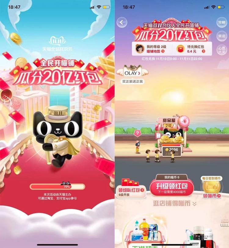 一方面是通过组队“全民开喵铺”,瓜分20亿红包。这是对去年双11合伙人制的一种升级,也是今年天猫618互动玩法的一种延续。