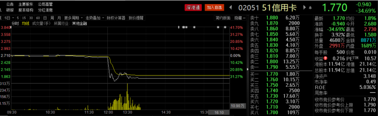 21日上午大量警察突击清查港股上市公司51信用卡位于杭州西溪谷的办公地点,下午港股开盘后该公司股价一度暴跌超40%,股价一度跌至1.58港元/股,创上市以来新低。此后午间公司在港交所披露易发布了停牌公告称“下午1时50分起短暂停止买卖”,停牌前其股价跌幅为34.69%,报1.77港元,总市值21.14亿港元。
