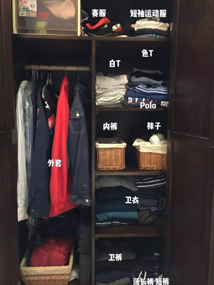 如图所示,大到外套、卫衣、卫裤,小到袜子,都分门别类,在衣橱里有固定的安放位置。