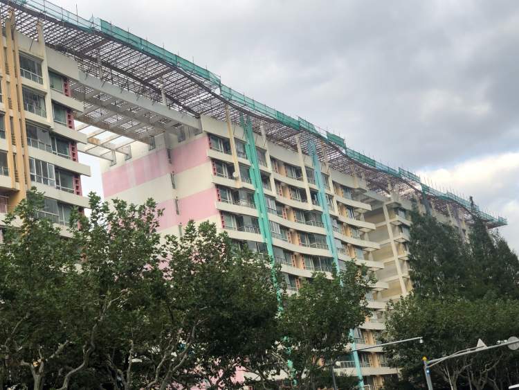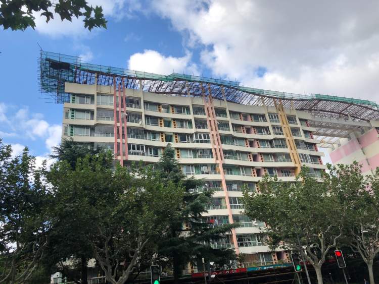 10月15日,周到君来到位于徐汇区华尔兹花园,在长达百米的沿街小区店铺门前满满的脚手架赫然在目,抬头一看居民区顶楼也被硬生生按上了“飞天支架”。