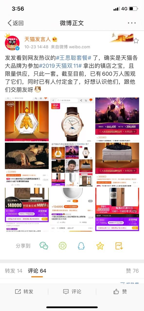 天猫发言人随后在微博表示:属实,都是限量供应,大部分只此一件。