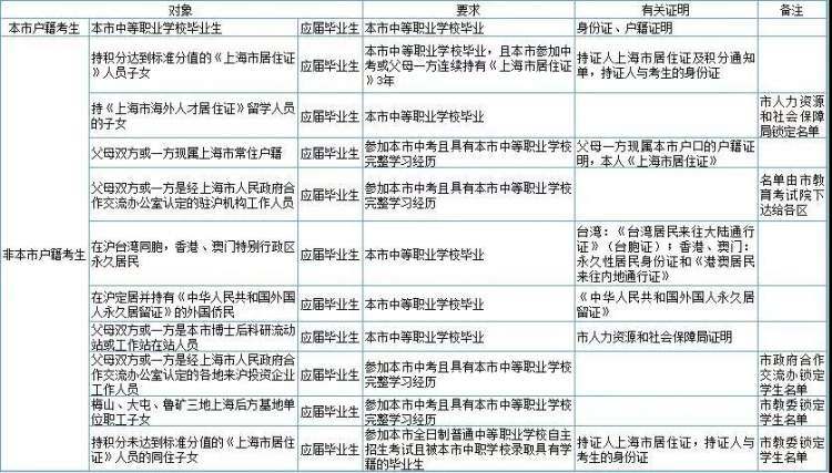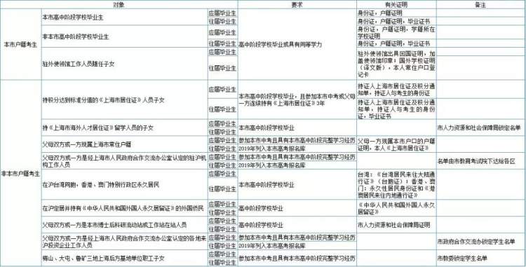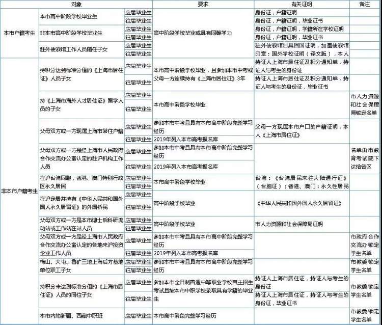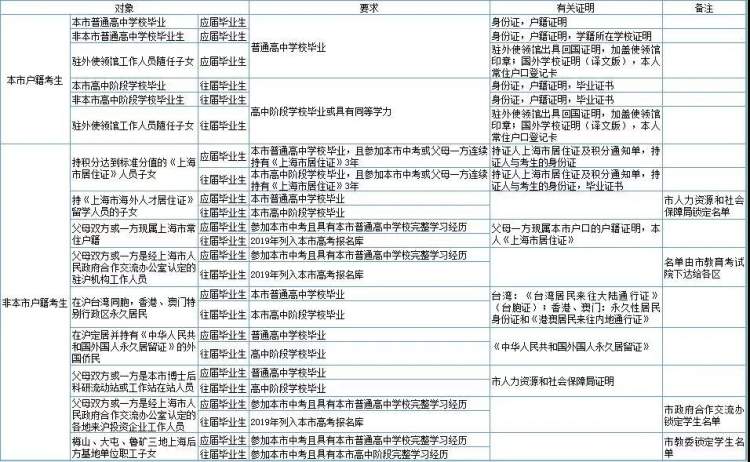 (1)考生父母双方或一方是经市政府合作交流办认定的各地来沪投资企业工作人员,且考生须是参加本市中考并具有本市高中阶段完整学习经历的应届毕业生或2019年已列入本市高考报名库的往届毕业生;