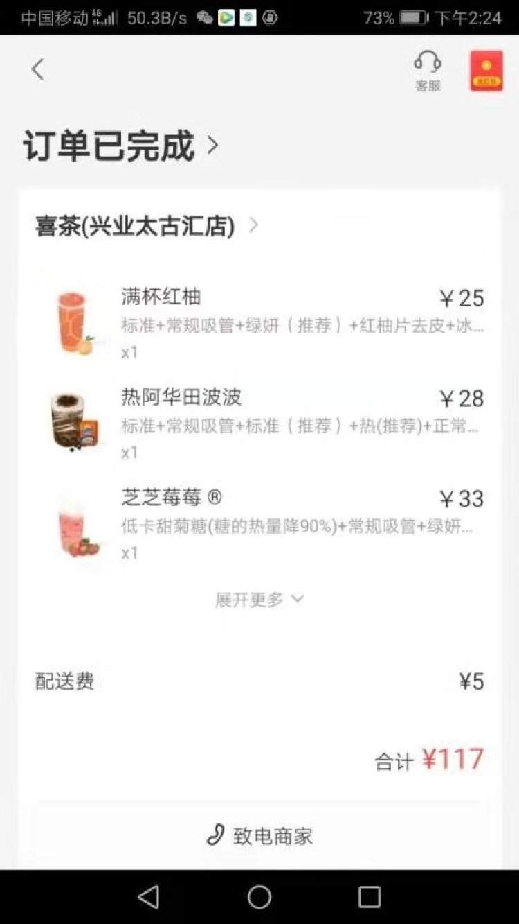 10月23日中午12时许,陈女士和三位同事通过外卖平台,在喜茶(兴业太古汇店)订购了四杯饮料,等待了近一个小时后,外卖终于送达。