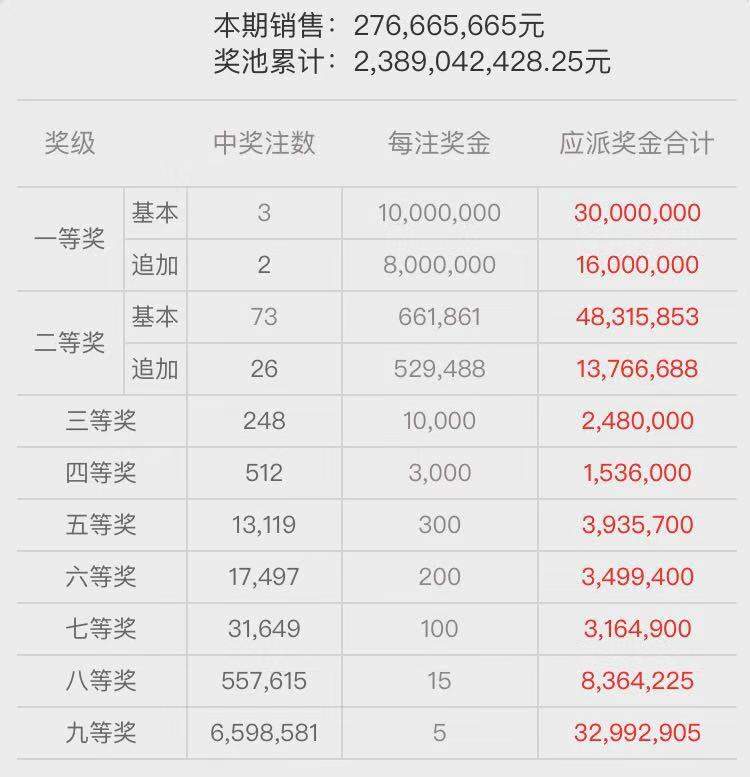 本期二等奖中出73注,单注奖金66.18万元。其中26注为追加投注,每注多得奖金52.94万元。追加后,二等奖单注总奖金为119.13万元。三等奖中出248注,单注奖金为10000元。四等奖中出512注,单注奖金为3000元。五等奖中出13119注,单注奖金为300元。六等奖中出17497注,单注奖金为200元。七等奖中出31649注,单注奖金为100元。八等奖中出557615注,单注奖金为15元。九等奖开出6598581注,单注奖金为5元。