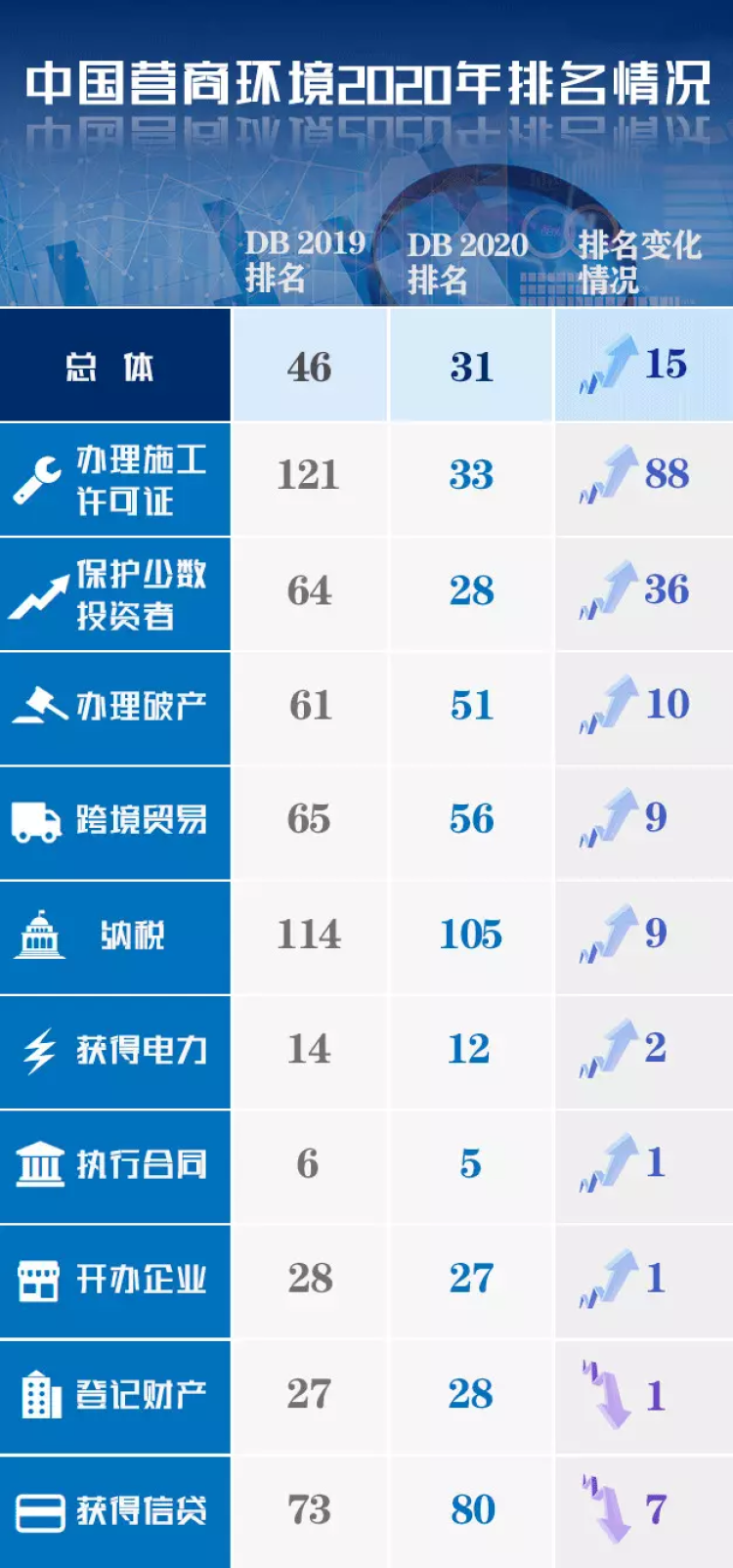 在世界银行最新发布的《2020年营商环境报告》中,中国排名再次大幅上升15位,位列第31位。这是继去年由第78名提升至第46名之后又一重大进步。