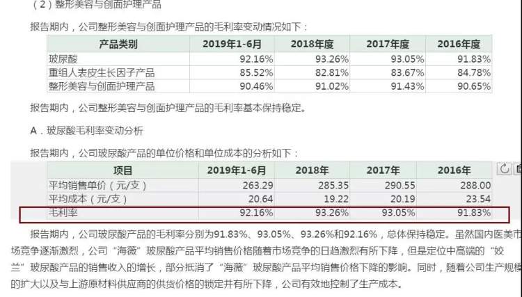华熙生物近三年毛利率超过70%,净利率超过30%。其中,2018年公司注射级原料平均销售价格为11.38万元/kg,毛利率为91.03%,和贵州茅台的毛利水平相近。昊海生科毛利率更是达到与茅台不相上下的93%。两家公司的招股书,也将玻尿酸的超高毛利公之于众。