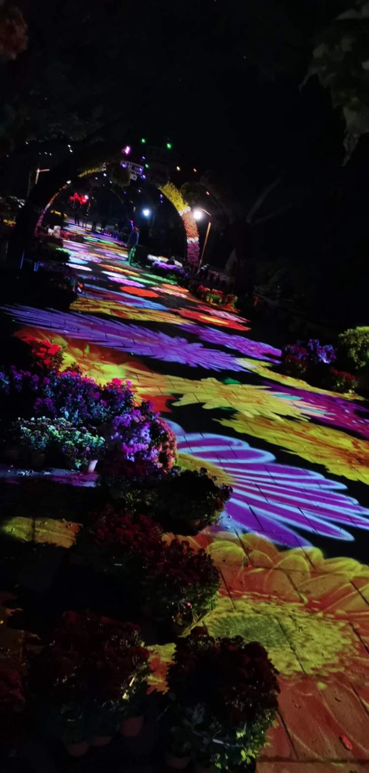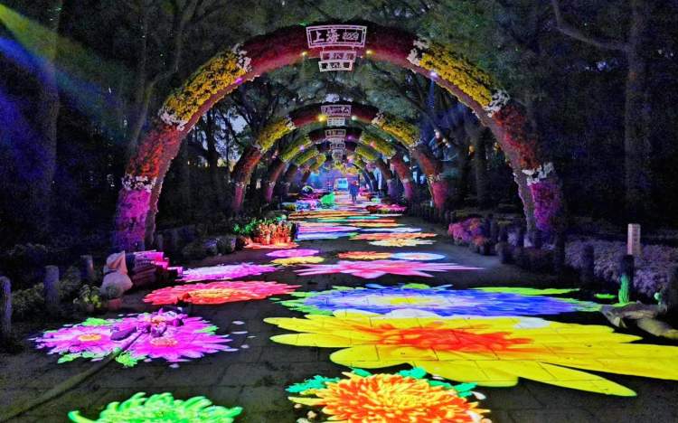 自西门百米迎宾大道至上海城市景点及中心草坪区域,利用既有路灯柱、树木等,通过激光、AI、VR、AR相结合的新媒体技术,在地面映射出百米炫彩花道,复刻光感名画竹灯,让游客在光影互动中感受缤纷灯光秀,还可通过手机扫描地面菊花投影,获得名菊科普讯息。