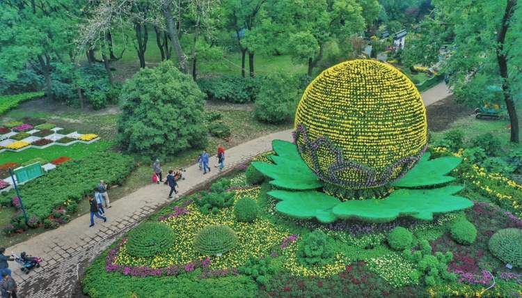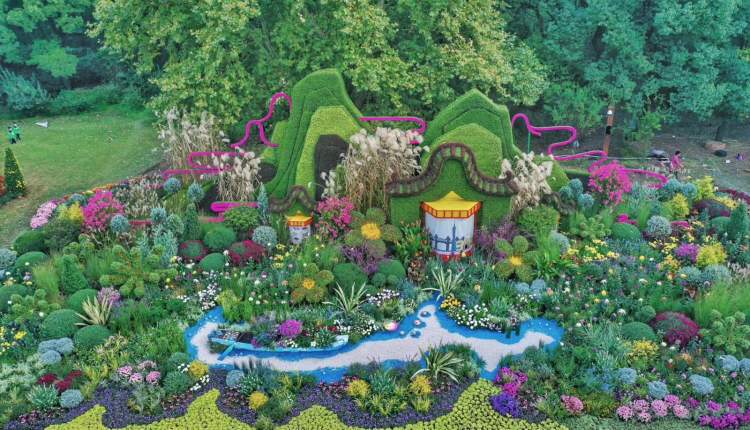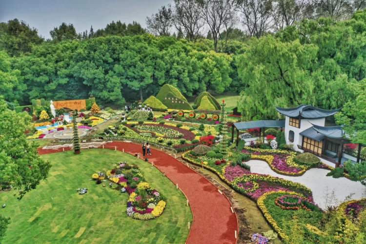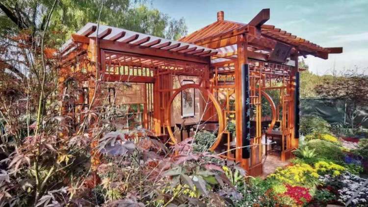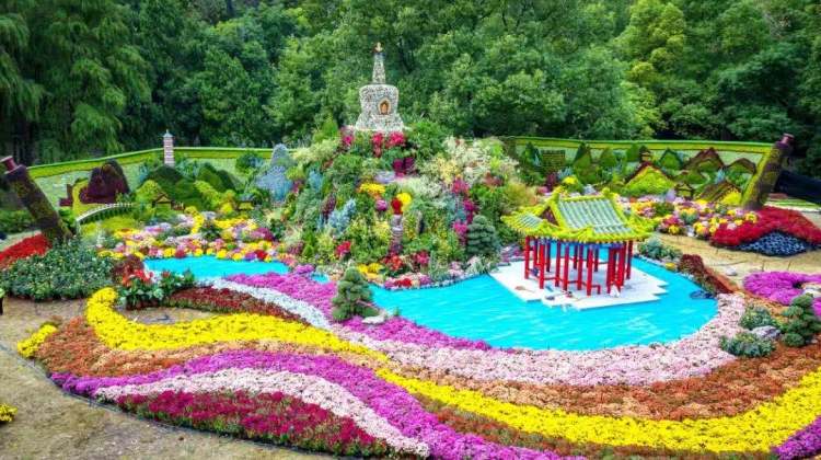 此次菊展布展过程中,共青森林公园巧妙地利用自身大量层次分明的植物群落形成天然背景,将30余万株、200多种本底植物以及15万平米水系与各种菊艺表现形式相融合,最大限度地运用自然空间进行布局,使各展区之间互为联系,紧凑而不拥挤,呈现出“看似林尽水缘处,又是万花丛中来”的独特观展体验。室外菊花造景不仅体量庞大、视觉震撼,更融入了十足的匠心,如以燕京八景为主题打造的浮雕立体画卷,呈现一幅精美绝伦的三维立体山水风景画;以菊艺打造出的步入式江南园林,精致细腻足以乱真。
