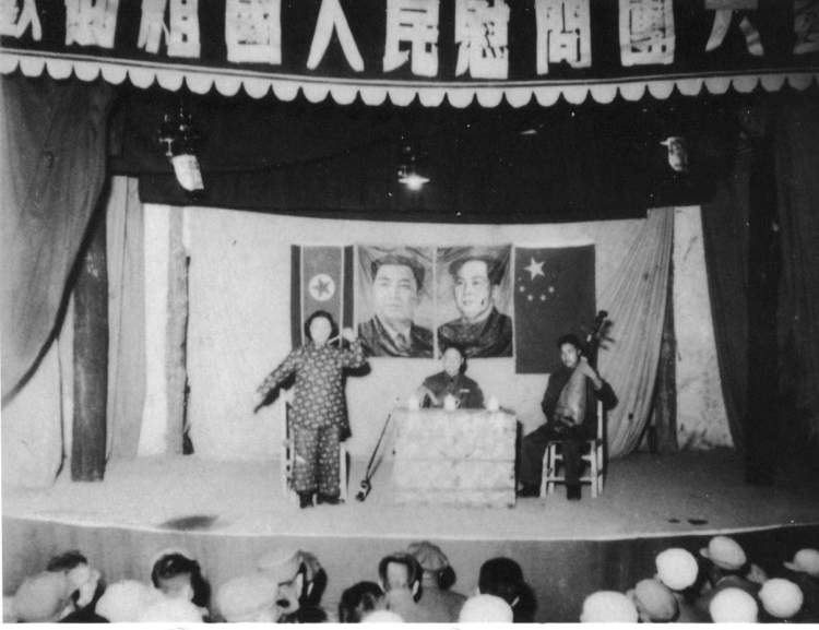到了朝鲜,他们在敌人飞机的轰炸下,频繁穿梭于各个战场,在坑道里演出,而且还是黄昏时刻,越演天越黑。