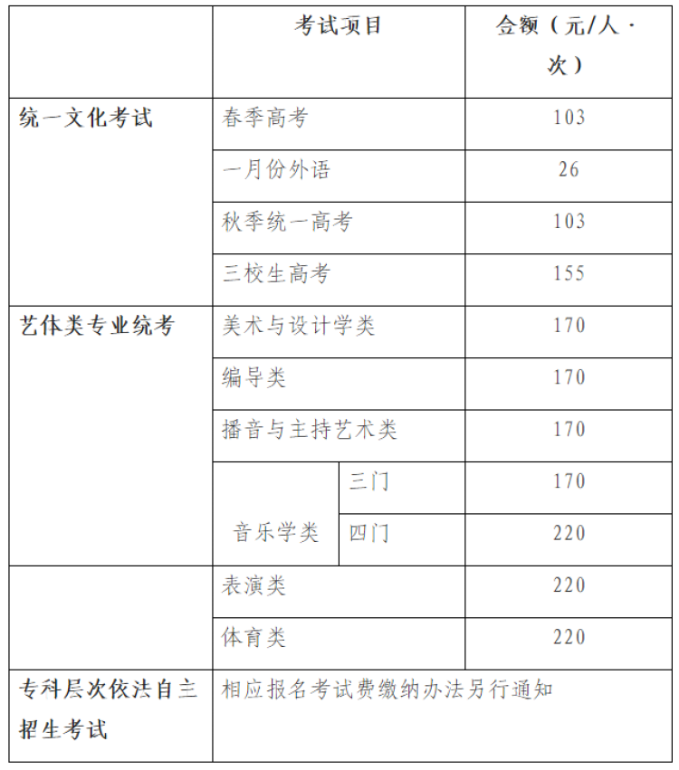 各类考试项目须缴纳费用如下表所示: