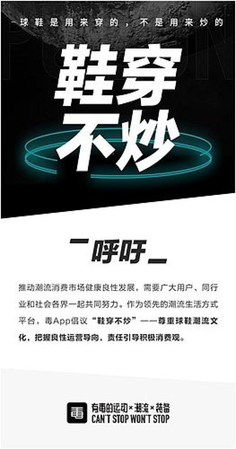 今年7月,作为潮流电商平台的毒 App,就发起了声势浩大的“鞋穿不炒”活动,公开对炒鞋现象喊话——“鞋是用来穿的,不是用来炒的!”