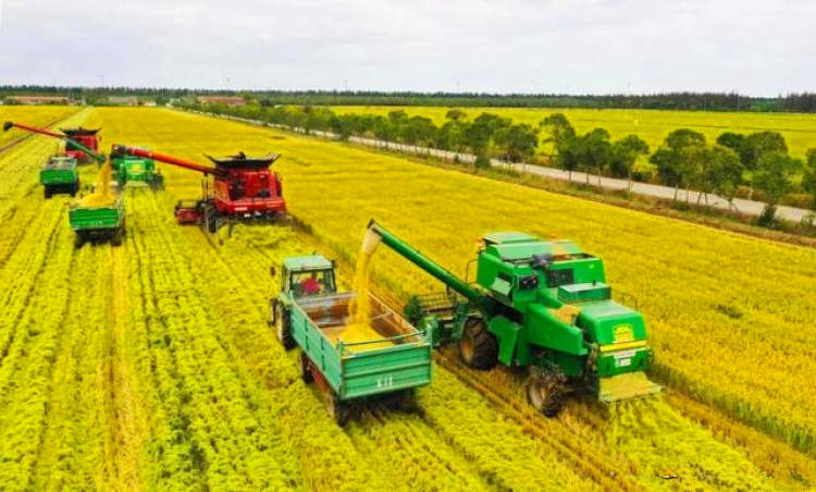 从9月下旬开始,光明米业集团崇明生产基地内,一台台收割机在稻田里来回穿梭工作,金色稻田里一派繁忙的景象。