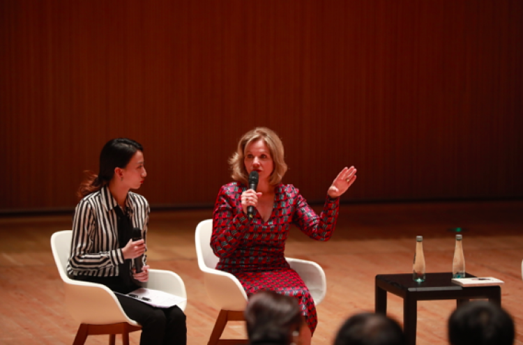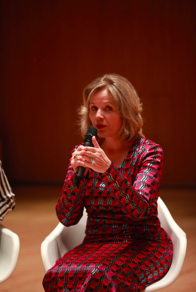 演出前一天,一头金发一袭红衣的她,精神满满地亮相上交音乐厅,与沪上乐迷近距离分享自己的成名道路。