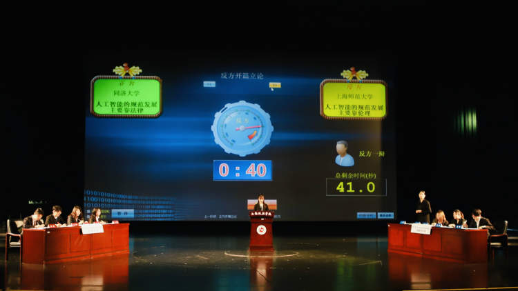 揭幕战由同济大学(正方)对阵上海师范大学(反方),就“人工智能的规范发展主要靠法律还是伦理”问题展开激烈辩论。