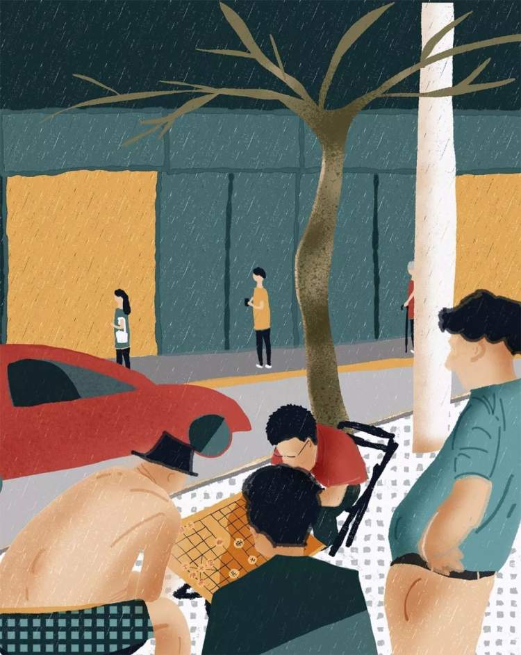 麻将桌的位置上,爷叔还是那个爷叔,只是服装从春天的厚夹克变成了一套头短袖睡衣,光脚伸在拖鞋里,正斜倚着栏杆,一手撑着头,一手抓牌。