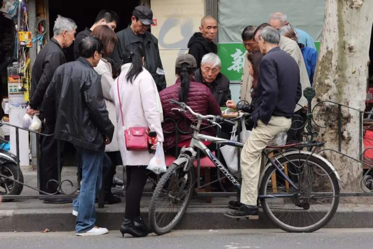 围观的人中,有的背着手拎着一袋包子,有的抓着一瓶饮料,也有的提着一盒青团。