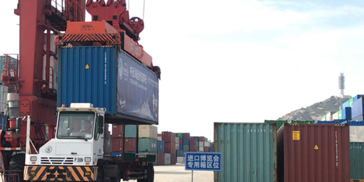 近日,记者在洋山深水港一期码头看到,一一个“进口博览会专用箱区位”的牌子设在港区内,与其他层层堆叠的集装箱区不同,这块立牌的后方,每个箱位只放一个集装箱。