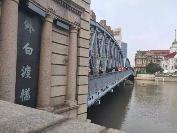 外白渡桥是中国的第一座全钢结构铆接桥梁和仅存的不等高桁架结构桥,但关于桥名“外白渡桥”的来源至今仍存在着许多的争论。据导游介绍,第一代外白渡桥建于1856年,名为“威尔斯桥”,是座木桥,由供职于怡和洋行的英国人投资建造的。但当时建造好了的桥需要向每个过桥的人收取过桥费,很多人都不愿意去。后来,边上又造了第二个桥,该桥建成后,凡是过河无需再支付过桥费,因此是“白”渡。