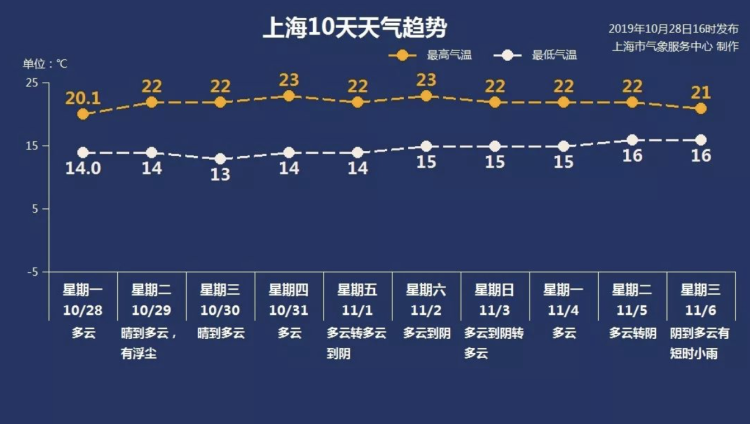 从目前的10天天气趋势来看,从明天起至下周初,申城最高气温在22-23℃,最低气温由低向高,总体在13-16℃之间;主要在晴或多云或阴天之间来回转换,基本干燥无雨。