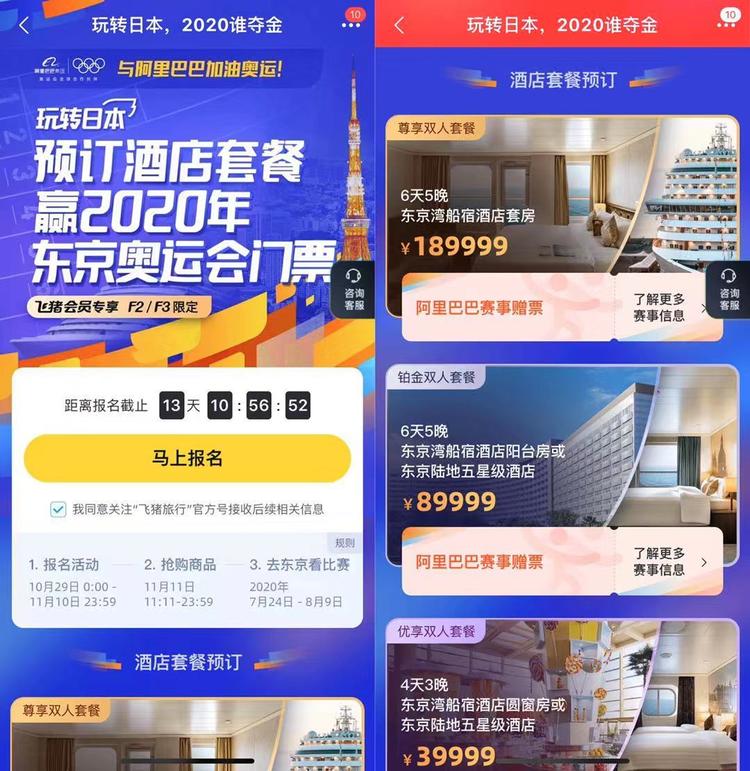 最后需要提醒大家的是,此次奥运套餐只针对飞猪f2/f3会员开放,报名时间从10月29日0点开始,到11月10日23:59结束,抢购时间为双11当日的11:11-23:59。