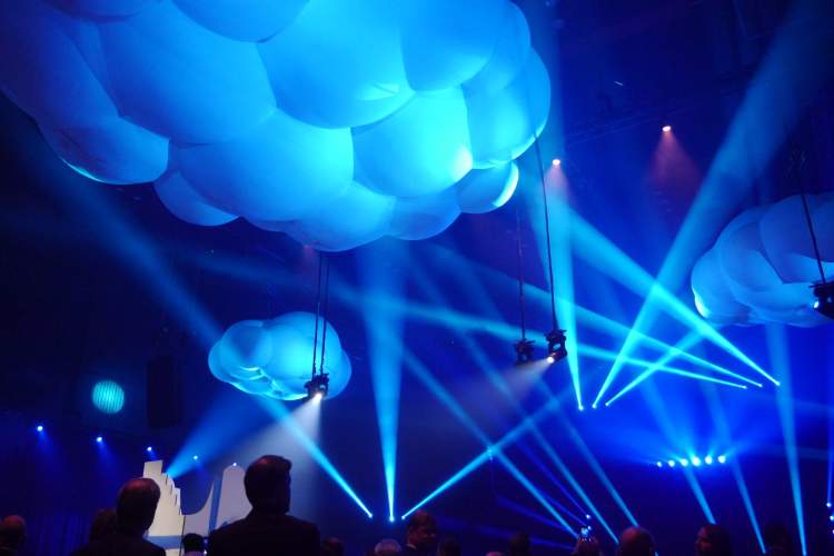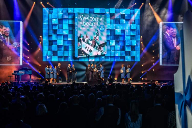当天的机库被装扮得十分切合荷航主题——数十米挑高的机库天花板上悬挂着朵朵白云,只是此时都被晕染上了荷航的标志色——大蓝色。当全场数百人同声齐唱生日歌时,这一场纵观荷航令人叹为观止的百年历程的生日大趴体终于启幕了。