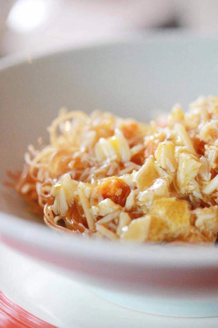 两面黄对上海人来说,一定不陌生。不过当蟹粉遇到两面黄,足以让所有人都眼睛一亮。蟹黄蟹膏醇厚,芙蓉蛋鲜嫩,盛于宛如金丝的焙面之上,从里到外均炸至酥松爽脆的细面饱蘸浓香四溢的蟹香,堪称这道菜的点睛之笔。脆面与蟹粉相拌食用,入口回味无穷。就连配菜与酱汁都炒过,恰到好处地迎上清口,这就是能让人产生幸福感的食物啦!