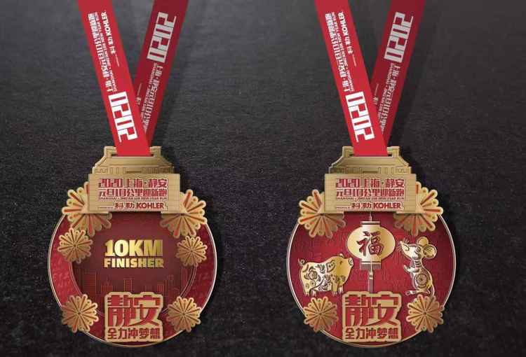 完赛奖牌底纹一面是高速发展的国际静安,一面是代表中华传统文化的多种字体的“福”字;一面是完赛组别和公里数,一面是辞猪迎鼠的新年冲刺,辞旧迎新,迎接新年来临。