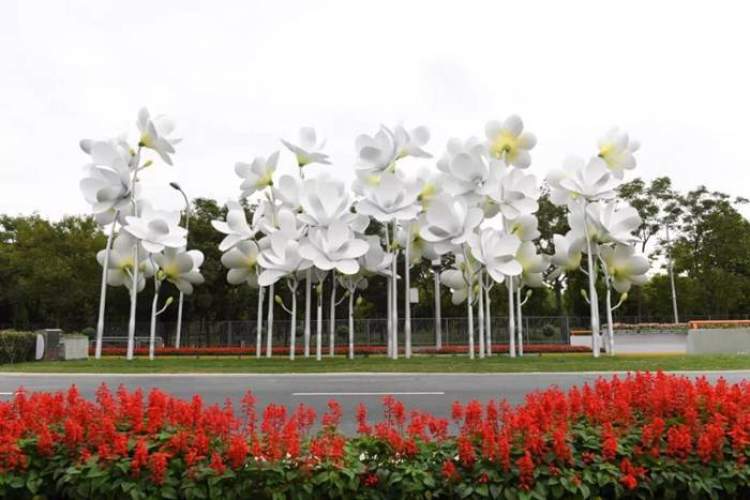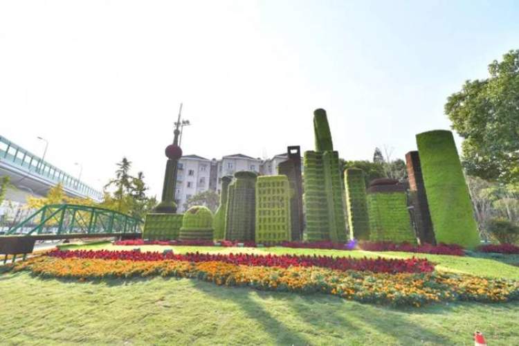 今年,虹桥商务区还在重点区域范围内完成绿化提升10余万平方米,新增各类大型花镜花柱等20余处主题景点。建虹路下匝道憨态可掬、招手行礼、热情洋溢的《大进宝》、七莘路沪青平公路路口展现从“外白渡桥”到“东方明珠”的《上海印象》等四处绿雕把商务区点缀地生机灵动。