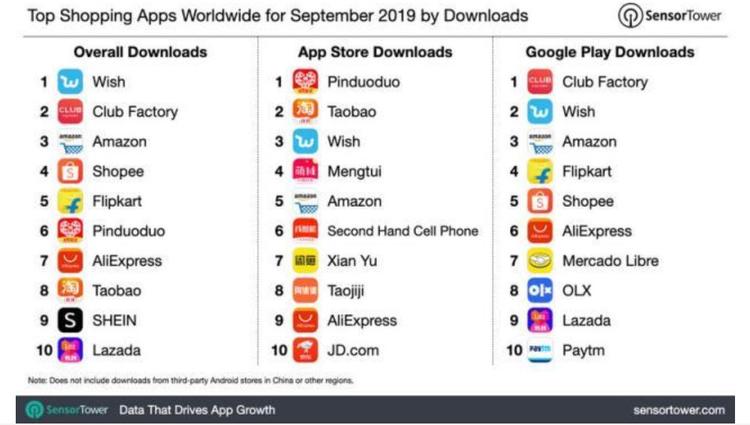 安卓市场方面,Sensor Tower的数据显示,Club Factory、Wish、亚马逊分列全球下载榜前三。该项数据仅统计了Google Play商店的官方数据,未统计包括腾讯应用宝、华为应用商城、小米应用商店等在内的主流第三方Android下载平台,此类第三方平台是Android应用最大的下载源。