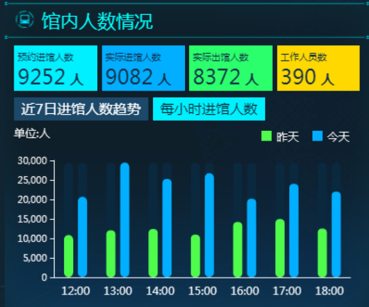 车站方面甚至对馆内人数情况也能做到了如指掌。包括预约进馆人数、实际进馆人数、实际出馆人数、工作人员数量,最近7天进馆人员趋势(有曲线图)、每小时进馆人数对比,随时能在车站内部的屏幕上查询,还可以对比昨天和今天的数据。