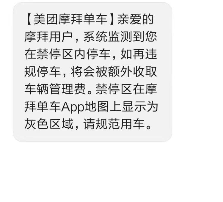 今天上午,记者来到人民广场附近尝试骑行摩拜,骑行完毕后将车辆停放在禁停区域内,不一会手机便收到了相关提示短信。