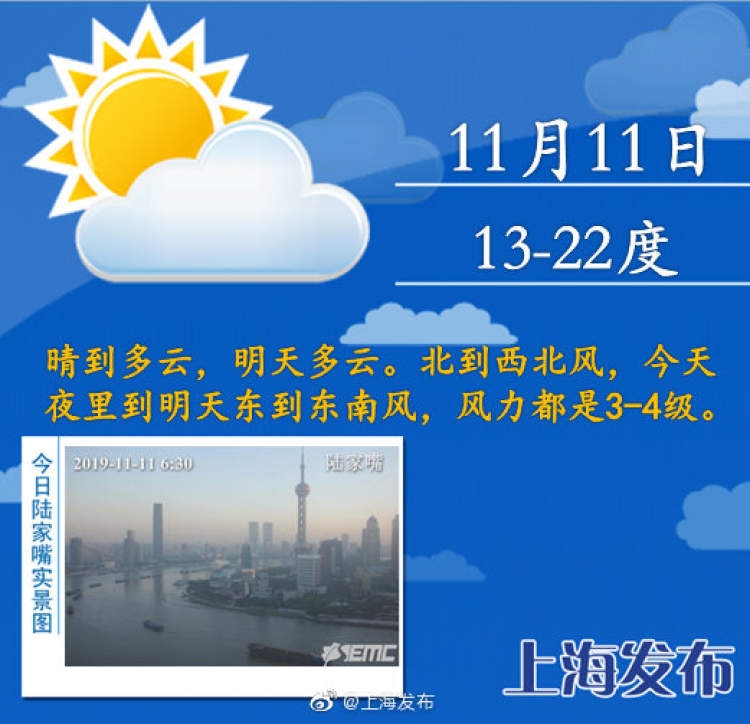 晴到多云,13—22℃ ,冷空气已发货! 周到君 2019-11-11 来源:周到上海 新的一周又开始啦!大家早上好!今天申城晴到多云,白天体感舒适,最高温22℃,最低温13℃,昼夜温差大,早出晚归的朋友们需注意保暖,不要感冒啦! 近期魔都基本不受雨水侵扰,大都是晴或多云的天气,后天受冷空气影响,将有一次云系增多和降温,并可能伴有短时小雨的过程,不过影响不大。 来源:周到上海 作者:周到君 赞一个 (0)