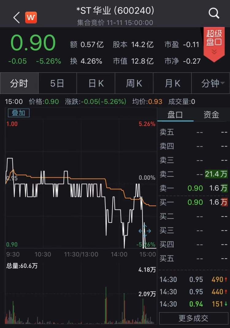 然而,双11其股价大“打折”,这只被称为A股最顽强的面值退市股*ST华业,没有迎来神转折,退市尘埃落定。11月12日将成为其在A股的最后交易日。