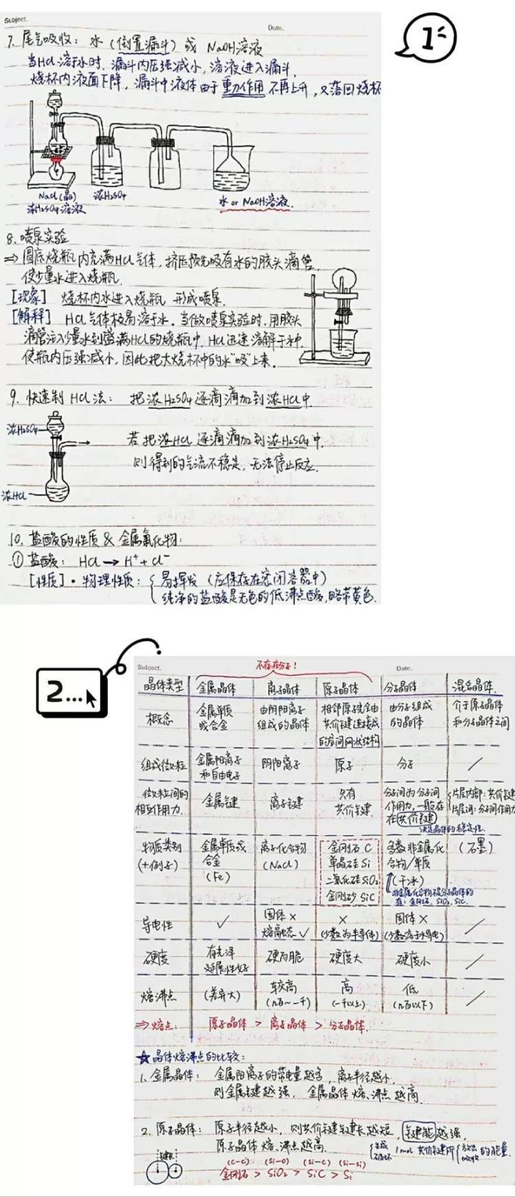 这是我的化学笔记。用图文并茂的方式来描述化学实验操作,列表格归纳整理知识点,将重点、难点、易错点用彩色笔标出。
