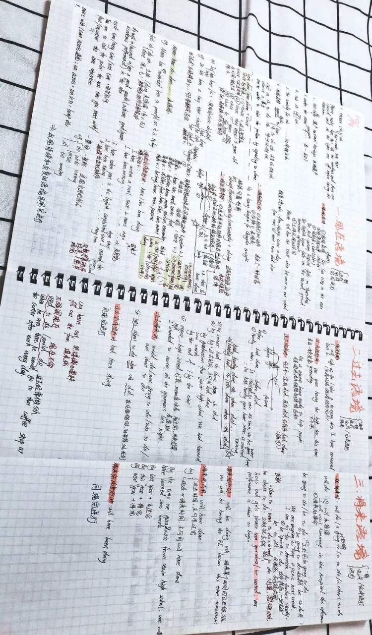 这是英语时态语态的笔记。为方便复习,我把它们分成了三种语境,再分成了几种时态来记笔记,虽然内容很多,但是每个题头都用了荧光笔,找起来很方便。