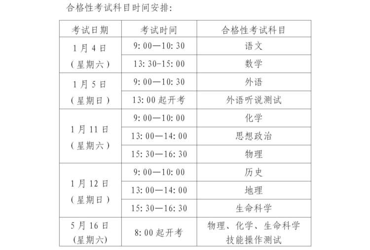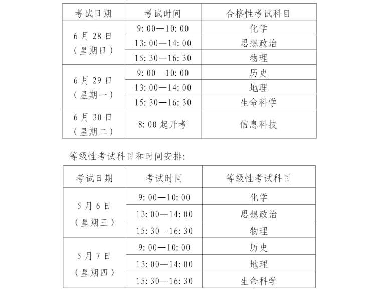 思想政治、历史、地理、物理、化学、生命科学6门科目分合格性和等级性考试,均以笔试形式进行,考试时间均为60分钟;其中,物理、化学和生命科学3门科目合格性考试另设技能操作测试,测试时间均为15分钟。