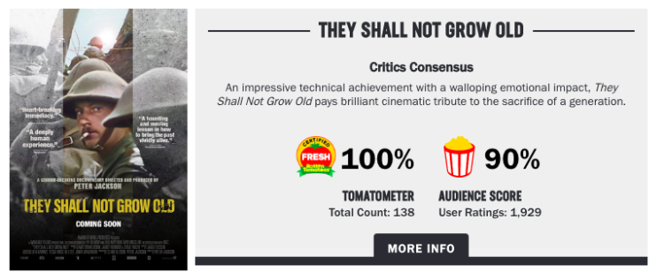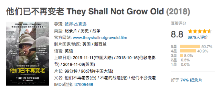 烂番茄新鲜度100%、豆瓣8.8分,这部近期上映影片中口碑最好的影片不容错过——由《指环王》《霍比特人》系列导演彼得∙杰克逊执导的战争纪录片《他们已不再变老》已于昨日在全国艺联专线正式上映。
