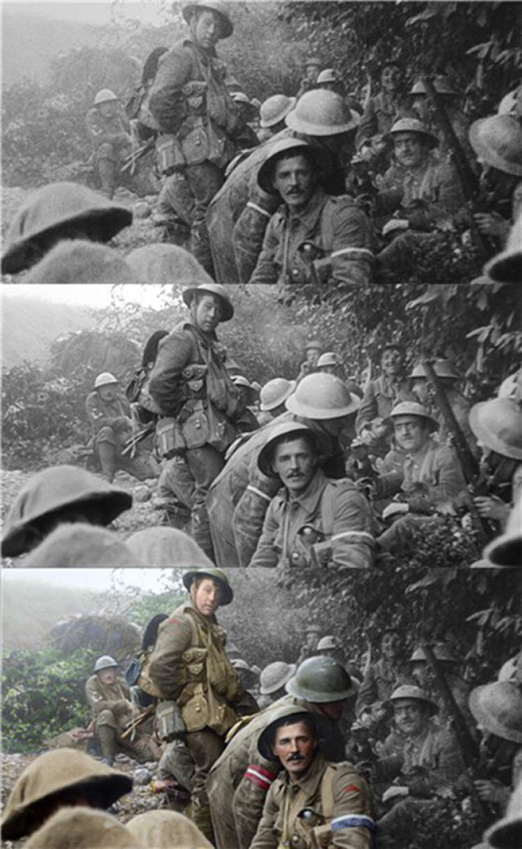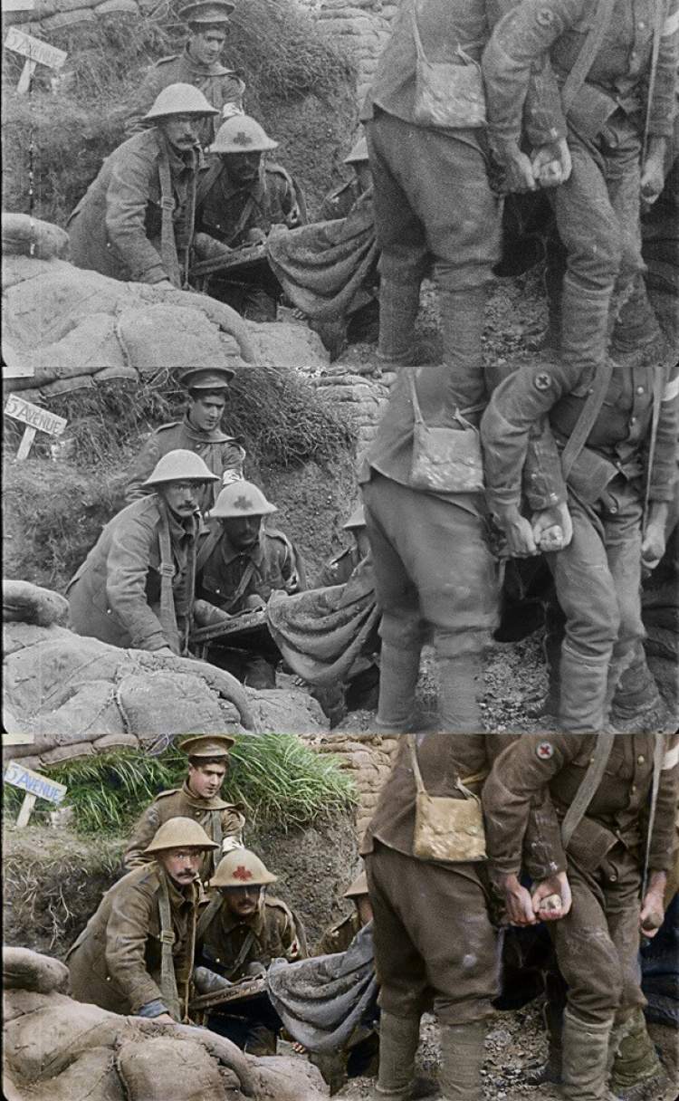 来自Stereo D的数百名艺术家参与了最艰难的着色阶段。为了让老胶片的颜色既还原真实又清晰自然,彼得∙杰克逊亲自探访一战实地,拍摄了1000多张照片用来为场景上色作参考。