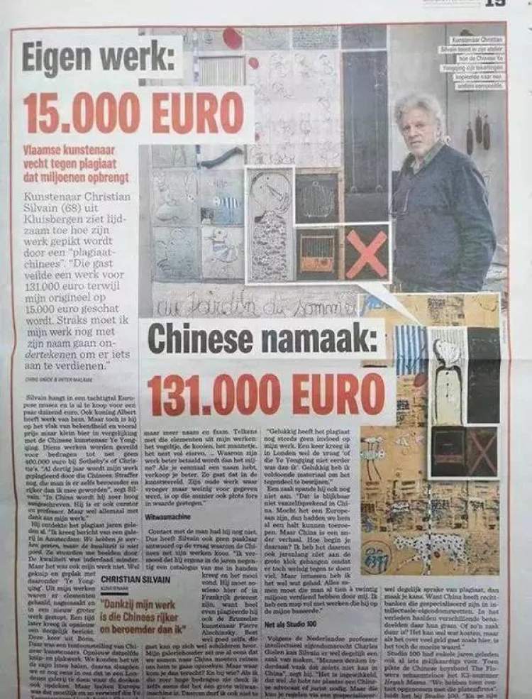 西尔万在采访中向外媒表示,自己的一幅画最多能出售6000欧元,“但是抄袭后的作品会是100倍以上的价格。最近一次叶永青在克里斯拍卖行上的画作最终以60万欧元成交。”