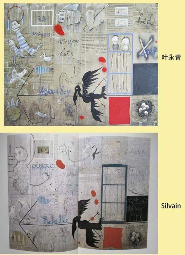 西尔万发现,叶永青抄袭了他创作的作品:“鸟、鸟巢,鸟笼、红十字架、飞机……一切都在那里!除了我的名字,否则看起来根本就是一样的!”