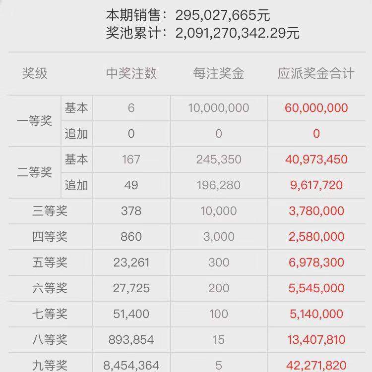本期二等奖开出167注,每注奖金为24.53万元;其中49注采用追加投注,每注多得奖金19.62万元。追加后,二等奖单注总奖金为44.16万元。三等奖中出378注,单注奖金为10000元。四等奖中出860注,单注奖金为3000元。五等奖中出23261注,单注奖金为300元。六等奖中出27725注,单注奖金为200元。七等奖中出51400注,单注奖金为100元。八等奖中出893854注,单注奖金为15元。九等奖开出8454364注,单注奖金为5元。