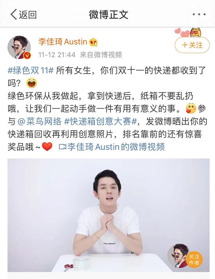 “大家离开一下直播间好不好,所有女生,点击淘宝首页搜索‘绿色双11’,点击承诺马上行动……大家退出佳琦直播间,去做一件有意义的事。”双11后第一天,李佳琦在淘宝直播时说道。
