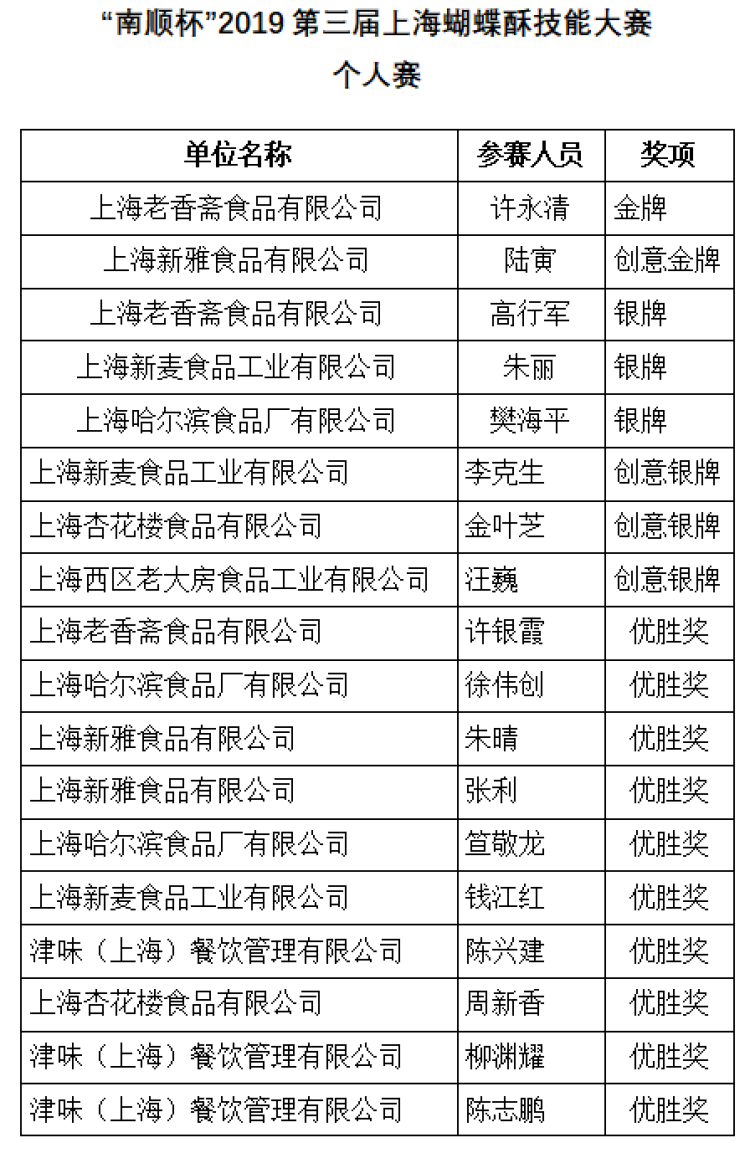 在今天举行的“上海市第三届蝴蝶酥技能大赛”上,来自国际饭店、哈尔滨食品厂、杏花楼、老香斋、新麦食品、新雅、牛奶棚、85度 c、宜芝多、静安面包房等近20家上海著名食品企业的50多名选手同台竞技,把一道来自欧洲的传统西点做出浓厚的海派味道,撑起上海特色旅游食品(伴手礼)独具风格的海派韵味。