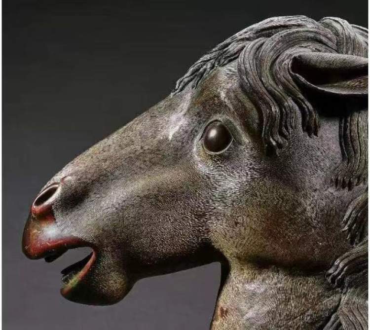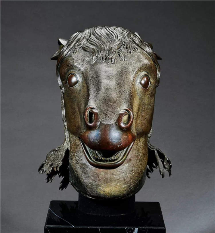 圆明园马首铜像是清代圆明园长春园西洋楼建筑群海晏堂外十二生肖兽首喷泉的主要构件之一。它由意大利人郎世宁设计,融合了东西方艺术理念与设计风格,清乾隆年间由宫廷匠师精工制作,以精炼红铜为材,色彩深沉厚重,以失蜡法一体铸造成型,神态栩栩如生,毛发分毫毕现历经百年风雨而不锈蚀,展现出极高的工艺水准。