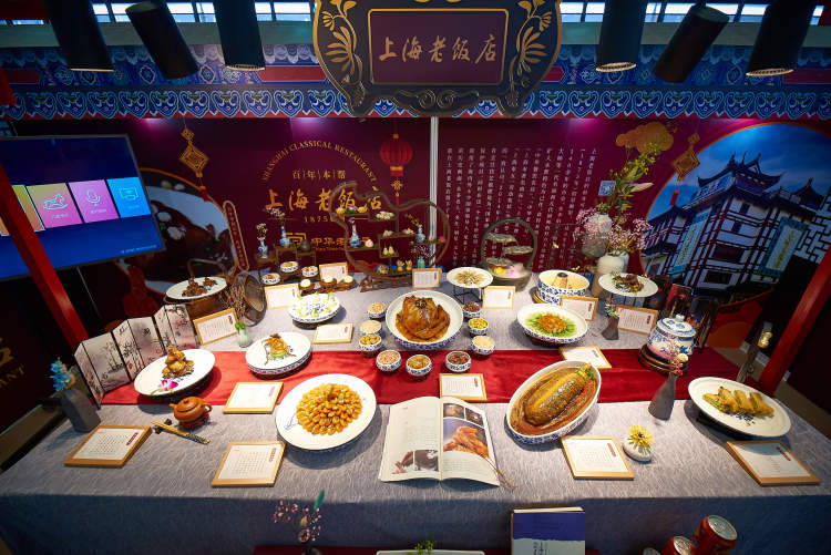走进上海老饭店的展位,入目所见即是老饭店标志性的大气红与典雅金,浓郁的中式气息扑面而来。随即,立刻被一股浓郁的香味所吸引。金牌八宝鸭、本帮油爆虾、金沙大乌参、精扣三丝、水晶鸭舌、蟹粉菜心……作为国家级非物质文化遗产“上海本帮菜肴传统烹饪技艺”的保护单位,此次老饭店在现场展示了足足有十六道本帮菜肴点心,既有传承,更有创新,令人目不暇接。