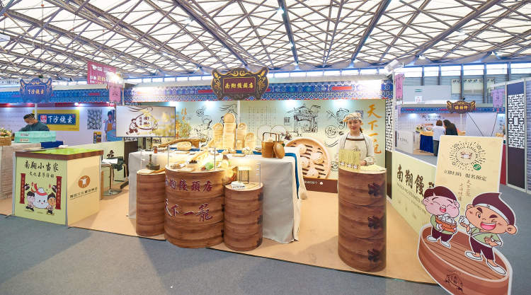 距今已有119年历史的豫园南翔馒头店,素来以皮薄、馅丰、汁多、味鲜、形美的小笼馒头而享誉海内外,一年365天每天都有长长的队伍在店前静候小笼馒头的出炉。因此,现场可以看到在古色古香的展台前设计有南翔馒头店标志性的蒸笼,背景墙的墙面上则是以图文并茂的形式讲述了南翔小笼馒头的传承史,以及如今由南翔小笼包捏技艺第六代非遗传承人游玉敏创制的双擀操作法,是如何让小笼馒头的皮更薄、肉更满、汁更多,更符合现代人的口味。